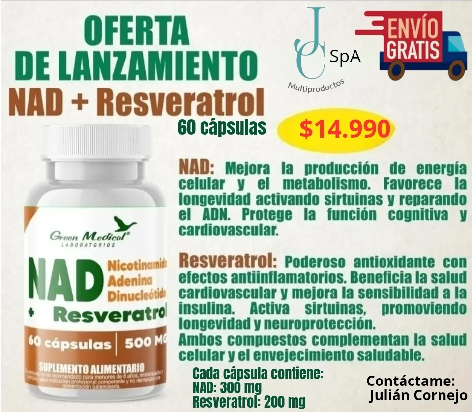 NAD : Mejora la producción de energía celular y el metabolismo. Favorece la longevidad activando sirtuinas y reparando el ADN. Protege la función cognitiva y cardiovascular.