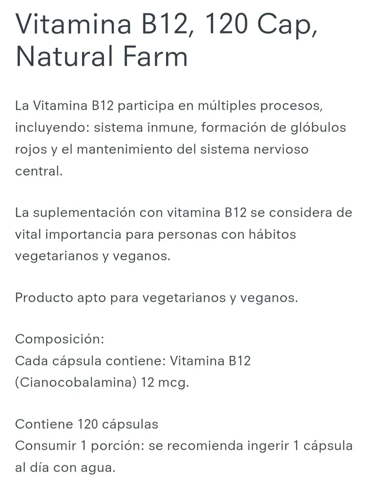 Descubre el poder revitalizante de la Vitamina B12 de Natural Farm, un suplemento esencial que promueve tu bienestar general y vitalidad. Con 120 cápsulas en cada envase, este producto está diseñado para aquellos que buscan una vida activa y saludable. ✨