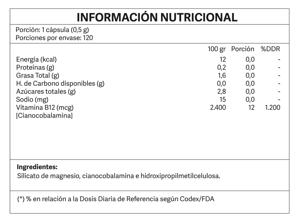 Beneficios Clave:- **Energía Natural:** La Vitamina B12 es fundamental para la producción de energía, ayudando a combatir la fatiga y el cansancio. – **Salud Neurológica:** Contribuye al correcto funcionamiento del sistema nervioso, favoreciendo la memoria y la concentración. – **Formulación Natural:** Elaborada con ingredientes de alta calidad, garantizando pureza y eficacia en cada cápsula. – **Fácil de Consumir:** Su presentación en cápsulas facilita la ingesta diaria, integrándose sin esfuerzo en tu rutina.